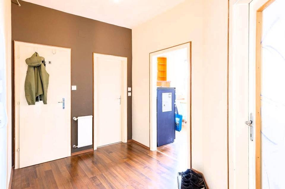 Vom Vorraum aus gelangen Sie zur Linken zum Vollbad und WC, des Weiteren sind zwei Zugänge zum Küchen- und Wohnbereich gegeben, die miteinander verbunden Loft-Charkter vermitteln. Vom Wohnbereich aus gelangen Sie ins Schlafzimmer.