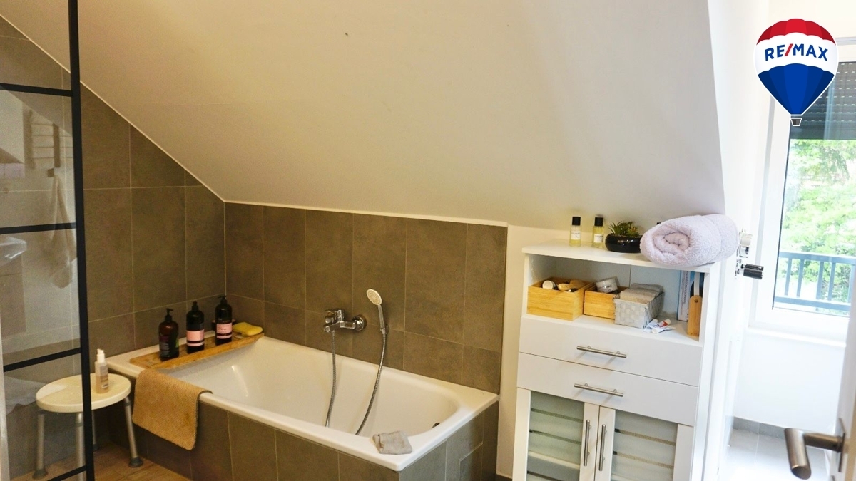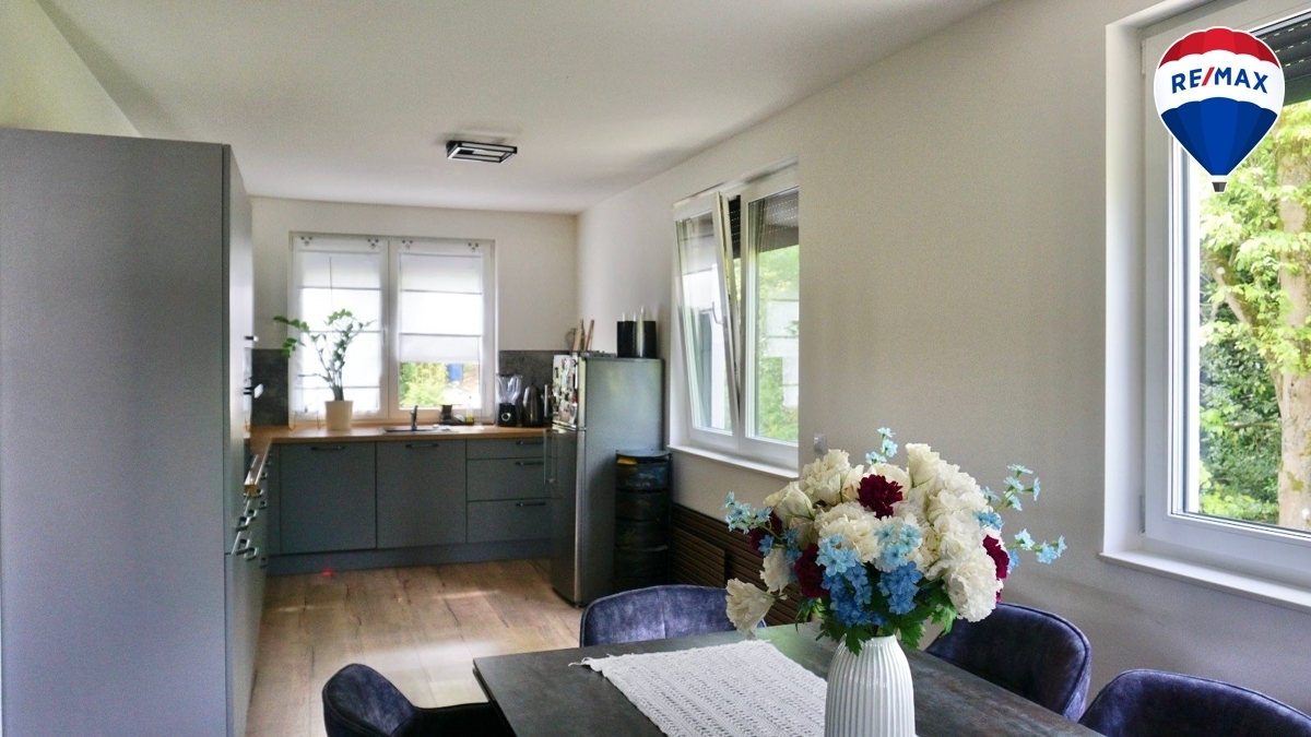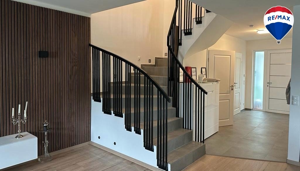 Die hochwertige Ausstattung sorgt für Komfort und Sicherheit: Eine Photovoltaikanlage unterstützt nachhaltige Energiegewinnung, während Fußbodenheizung und moderne Wärmepumpe für angenehme Wärme bei niedrigen Heizkosten sorgen. Elektrische Rollläden bieten Schutz und Bequemlichkeit und die wandeingelassene LED-Spots schaffen eine helle und freundliche Atmosphäre. Die moderne Einbauküche mit hochwertigen Geräten und die Einzelraum-Temperaturregelung bieten zusätzlichen Komfort. In jedem Zimmer sind zwei Internetanschlüsse vorhanden, und ein Stromanschluss für Elektroautos auf der Auffahrt sorgt für zukunftsorientierte Flexibilität.