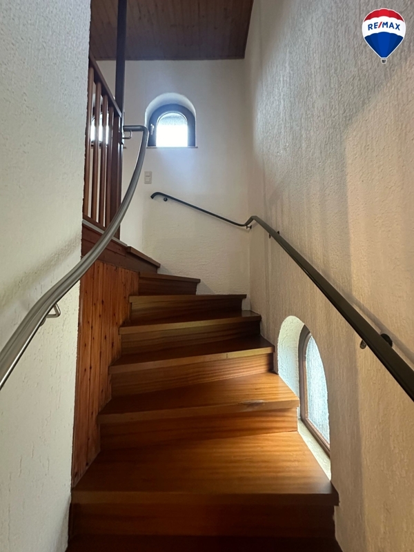 Eine Treppe am Ende des Flurs führt Sie ins Obergeschoss des Hauses. Dort erwartet Sie ein großzügiges und lichtdurchflutetes Wohn- und Esszimmer, das viel Platz für entspannte Stunden mit der Familie bietet. Durch eine Tür ist ein weiteres geräumiges Schlafzimmer mit genügend Freiraum für Ihre persönlichen Bedürfnisse verbunden.