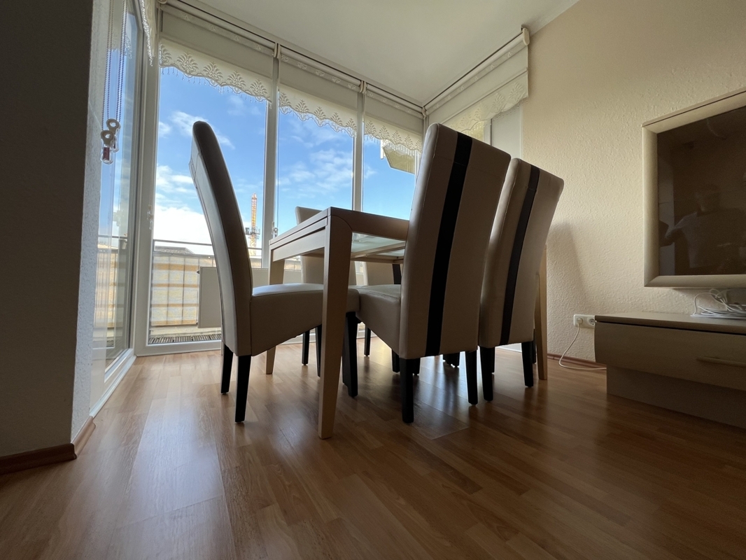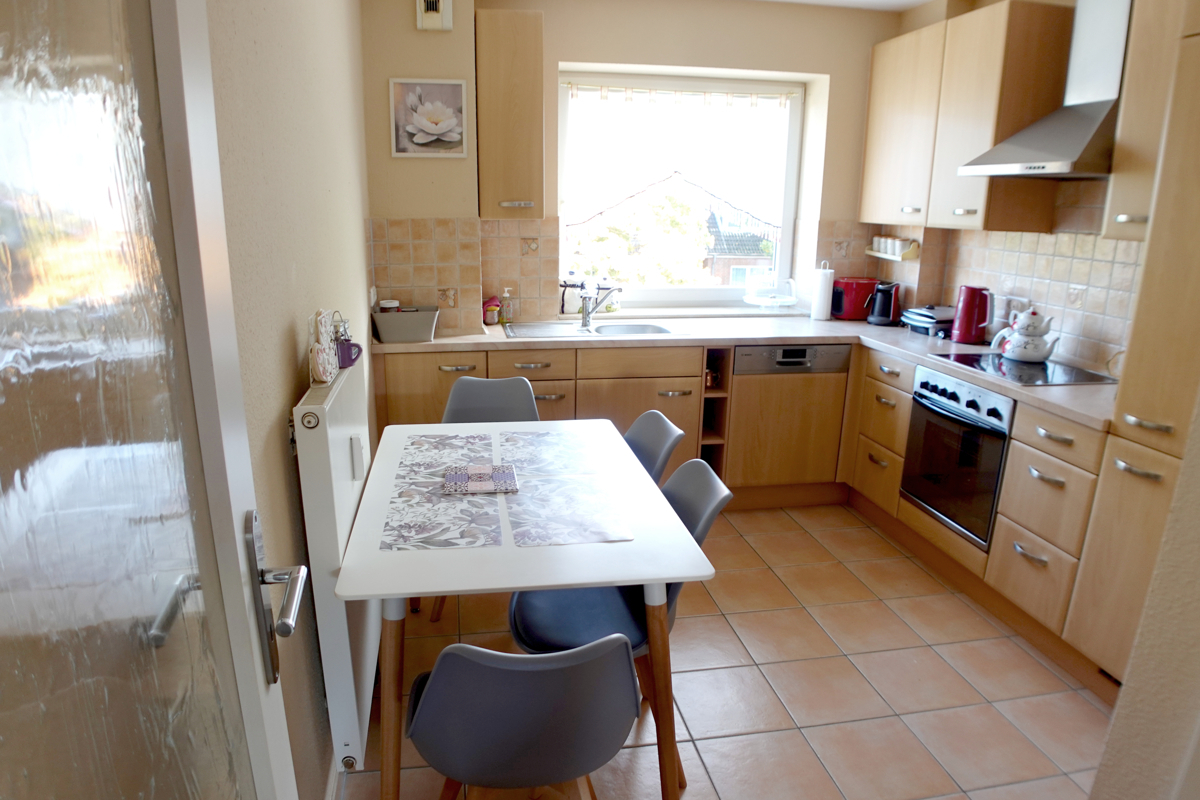 Wenn Sie die Wohnung betreten, gleich links, befindet sich die schöne Küche mit einer modernen Küchenzeile mit viel Stauraum und Platz für eine Frühstücksecke für den ersten Kaffee oder Tee am Morgen.