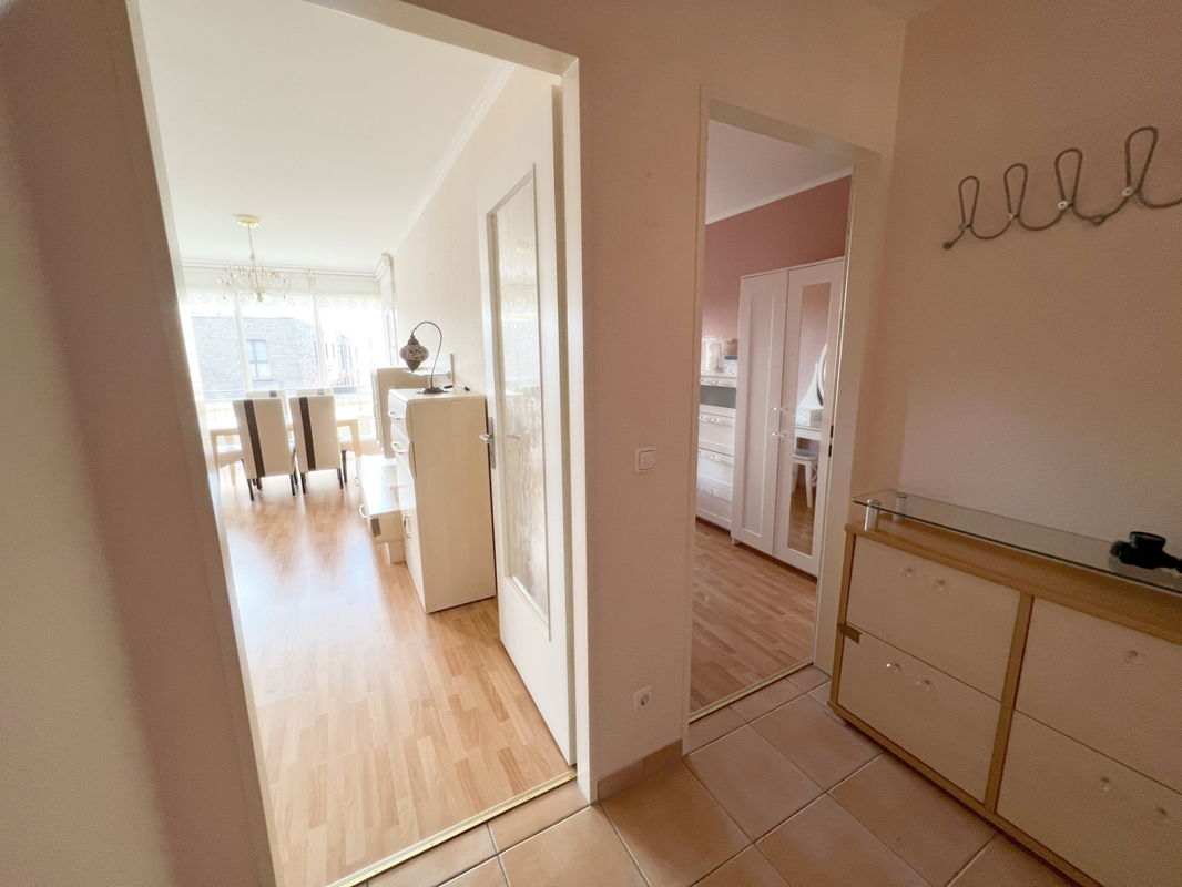 Durch die geräumige Diele gelangen Sie weiter in das große, lichtdurchflutete Wohnzimmer, mit Zugang zum Südbalkon, den Sie nach Ihren Vorlieben bepflanzen können und genießen von dort den wunderbaren Ausblick ins Grüne.