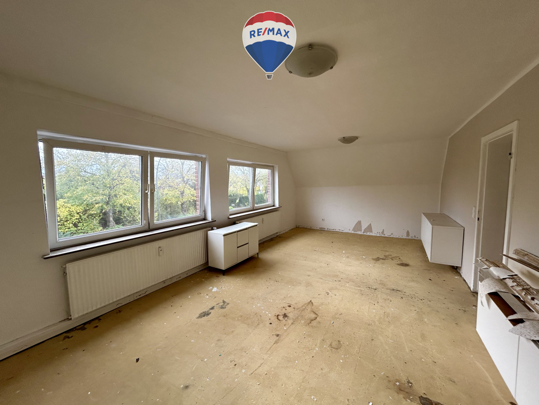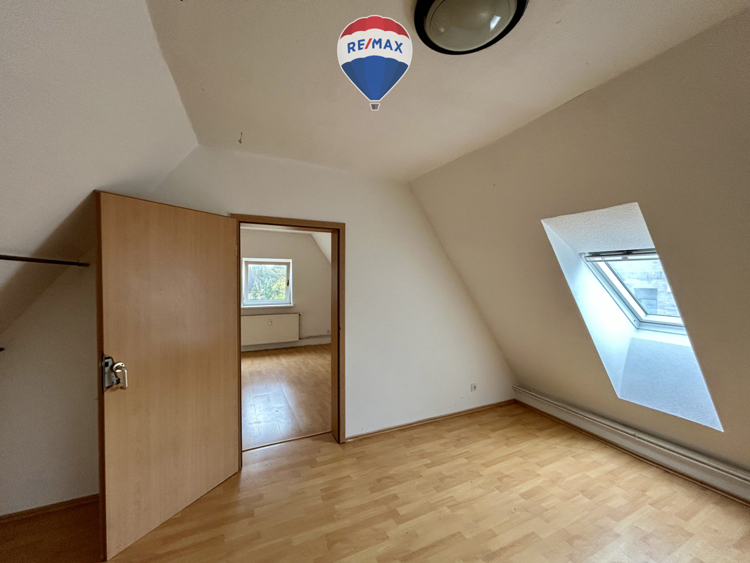 2 Zimmer, Küche, Duschbad. Eine Treppe führt in das ausgebaute Dachgeschoss, das zusätzliche ca. 15 m² Wohn- /Nutzfläche bietet. Auch hier fehlt derzeit eine Einbauküche.